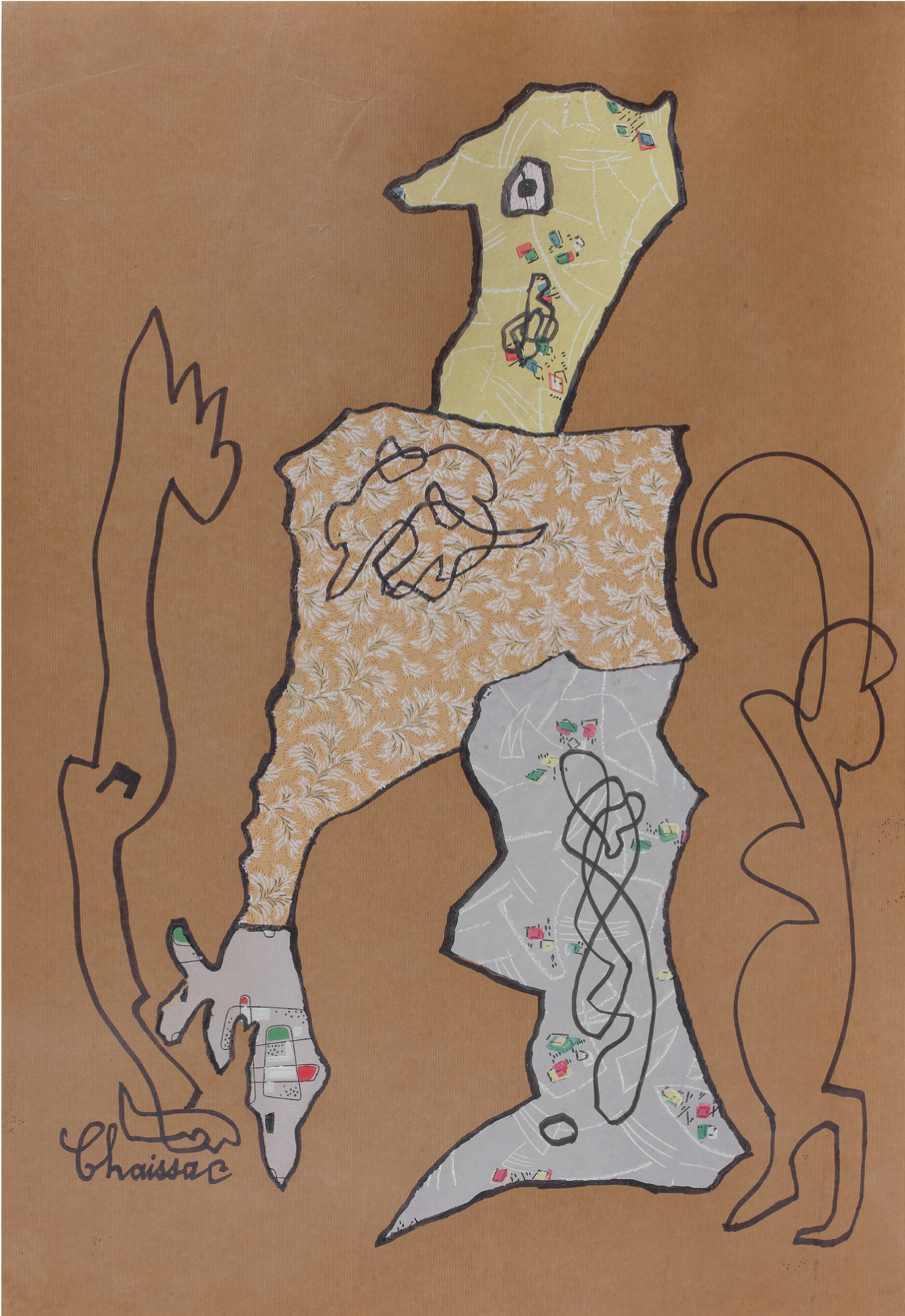 Collage et gouache sur papier kraft signé en bas à gauche
